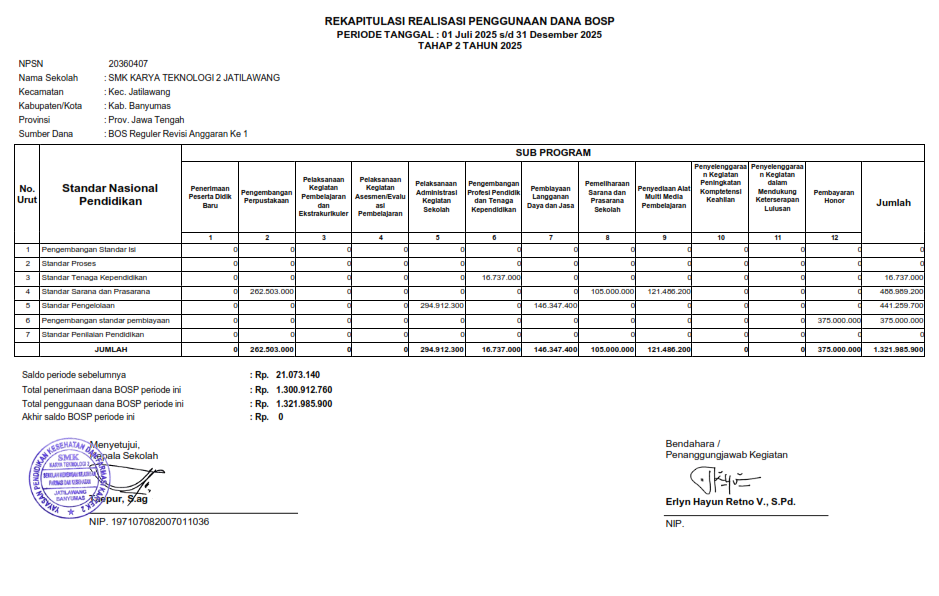 SMKS Karya Teknologi 2 Jatilawang merupakan salah satu satuan pendidikan yang mendapatkan dana BOSP tersebut, memiliki kewajiban untuk mengelola, menggunakan, dan mempertanggungjawabkan dana tersebut secara transparan dan akuntabel. Pengelolaan dana BOS harus sesuai dengan Juknis Bos yang berlaku serta prinsip efektivitas, efisiensi dan berkeadilan. Untuk memastikan pengelolaan dana bantuan pemerintah tersebut berjalan secara transparan dan akuntabel demi meningkatkan mutu dan kualitas pendidikan khususnya di SMKS Karya Teknologi 2 Jatilawang, berikut ini kami sampaikan laporan realisasi pengunaan dana BOSP Tahap II Periode Juli-Desember Tahun 2025 SMKS Karya Teknologi 2 Jatilawang yang dapat dilihat pada data berikut: